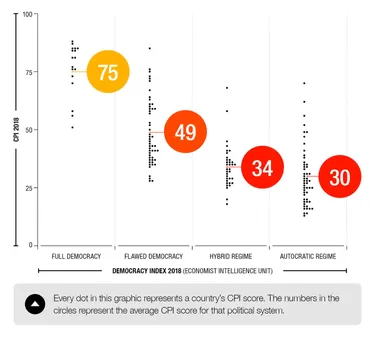 There are no full democracies that score below 50 on the CPI. Similarly, very few countries which have autocratic characteristics score higher than 50.